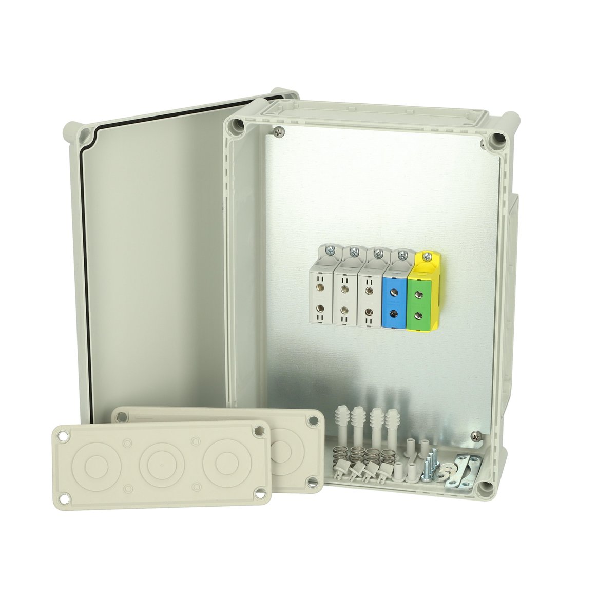 Afgreningskasse i polykarbonat med CuAl terminal 5 x 6 mm² – 95 mm² og gråt låg. Mål: 380x280x130 mm.