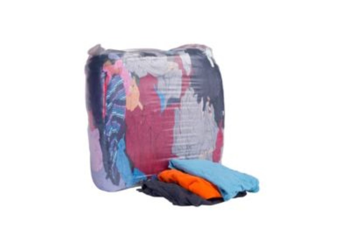 Kulørte klude i 10 kg pakke. Består af bløde og absorberende sweatshirts og poloshirts. Universelle og pakket i presset kuber i klare plastsække (ca. 40 cm x 40 cm).