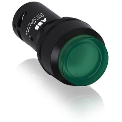 Lampe kiptryk med grøn farve, 1NO, sort plastikkrave og integreret LED. Designet til 110-130V AC/DC. Komplet højt lampe kiptryk med Ø 22mm fra ABB's kompakte serie.