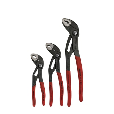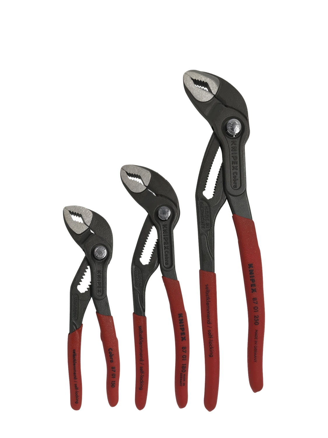 Knipex Cobra vandpumpetangsæt med tre forskellige størrelser (150, 180 og 250 mm).