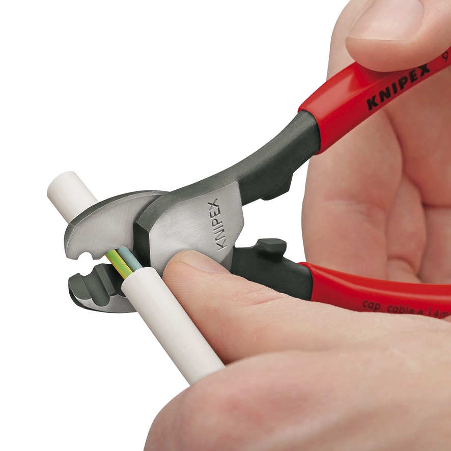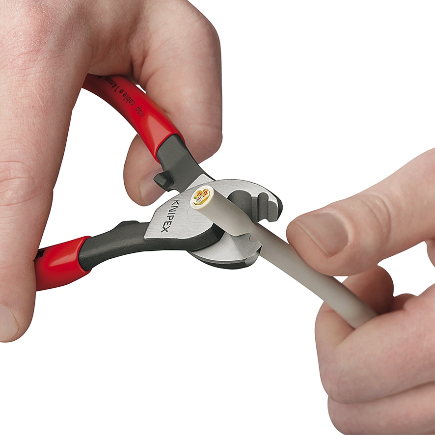 Knipex kabelsaks er designet til at klippe Cu- og Al-kabler, både en- og flertrådede. Den er uegnet til ståltråd og hårdttrukne kobberledere. Saksen har hærdede skær med præcisionsslibning, der sikrer et glat og rent snit uden at klemme.