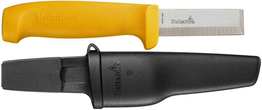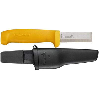 Denne kraftige stemmejernskniv er udstyret med en V-slebet stemmejernsfunktion. Kniven har en unik skede, der sikrer, at den ikke løsner sig fra knappen på arbejdstøjet, samtidig med at den er nem at fjerne.