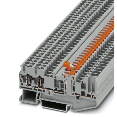 Knivskilleklemme med fjederkraft/stiktilslutning. Tværsnit: 0,08 mm² - 4 mm², AWG: 28 - 12, mærkestrøm: 20 A, mærkespænding: 400 V. Grå, til DIN skinne.