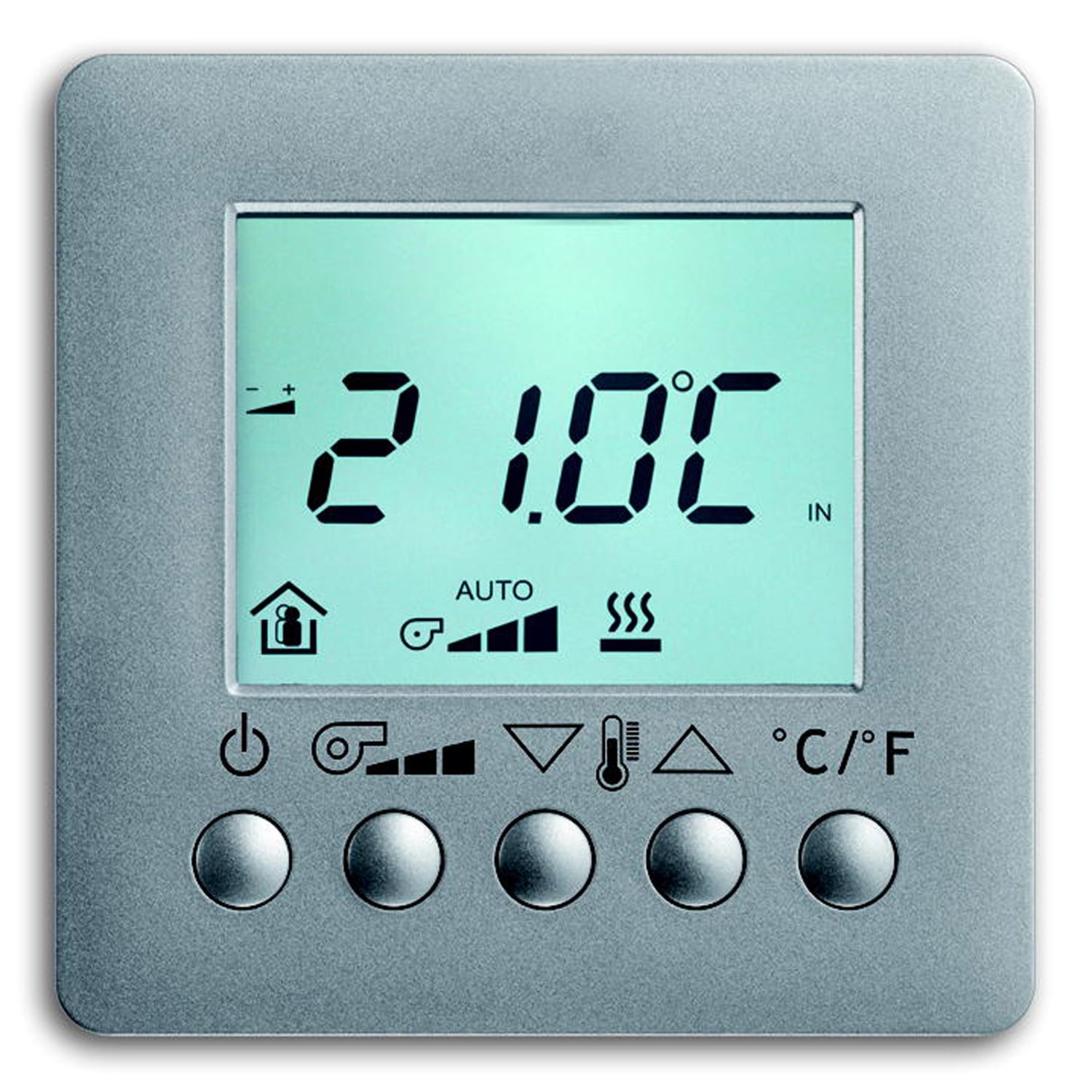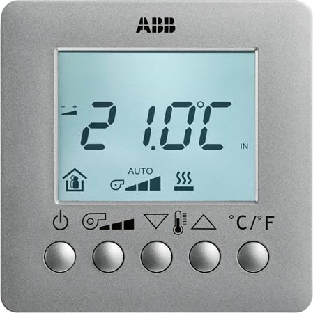 ABB KNX rumtermostat med LCD display. Sender rumværdier til ventilationssystem eller enheder med udgange (fx Room Master). Farve: Sølv.