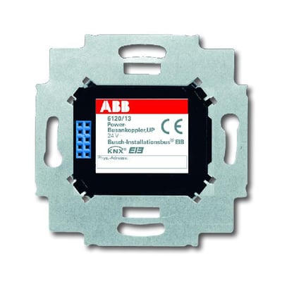 ABB KNX strømbuskobler, model 6120/13-500, designet til Busch-priOn bundrammer (2- og 3-modul). Kræver separat strømforsyning og anvender KNX-forbindelsen udelukkende til buskommunikation.