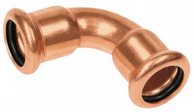 Kobber Cu press bøjning fra Sanha. 42 mm, 90º med to muffer. Til drikkevand og varme. Anbefales pressning med M-slynger. Med O-ringstætning EPDM.