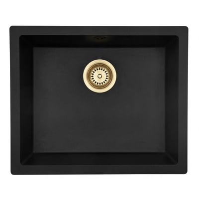 Lavabo Jupiter 600 UN køkkenvask er en lækker kompositvask, der kombinerer stilrent og tidløst design med praktisk funktionalitet. Den sorte overflade og det messingfarvede afløb giver et eksklusivt udtryk, der passer ind i mange moderne køkkener. Vasken er designet uden hanehul, hvilket giver fleksibilitet i placeringen af armatur.