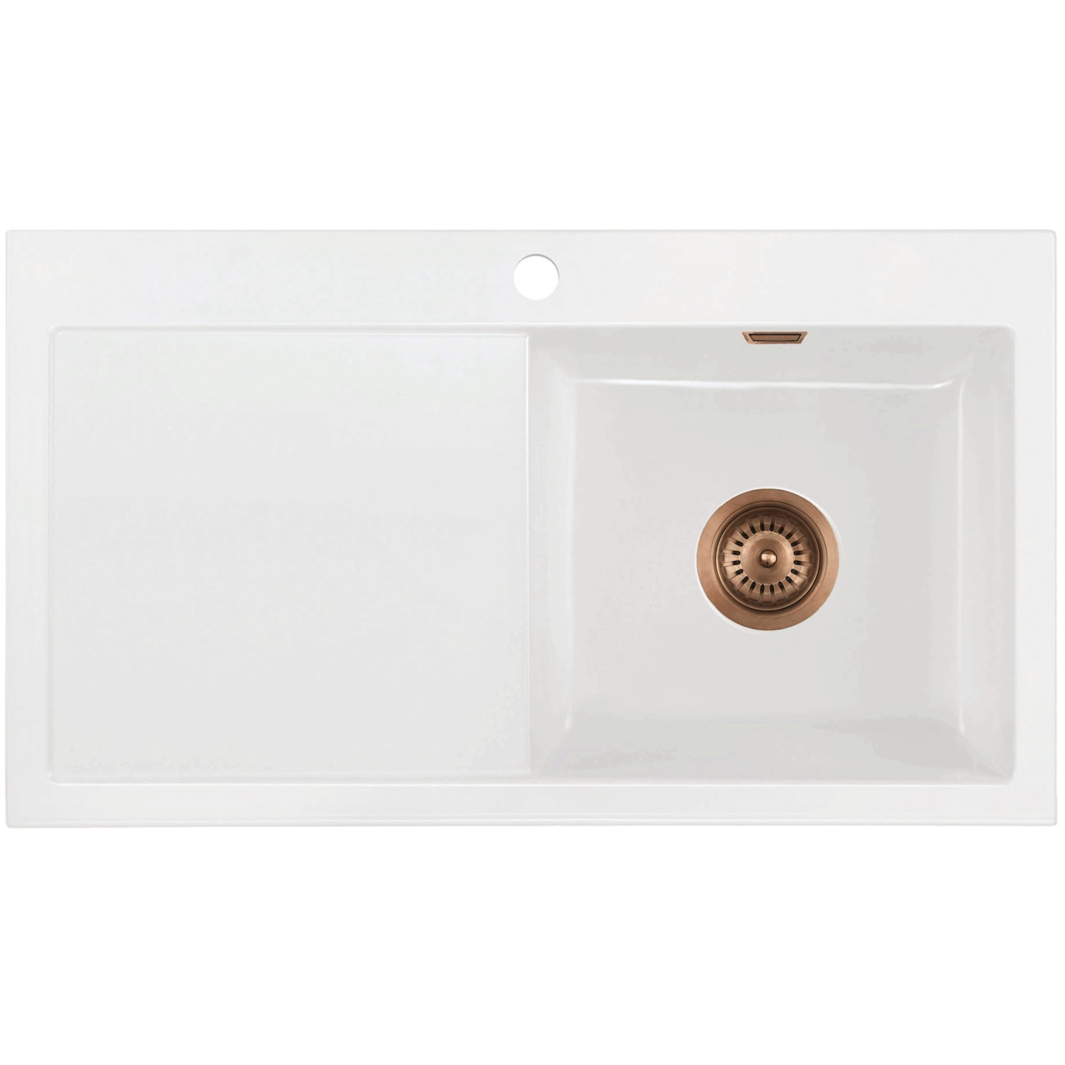 Mera 90 keramik køkkenvask med bakke, hvid med kobber afløb