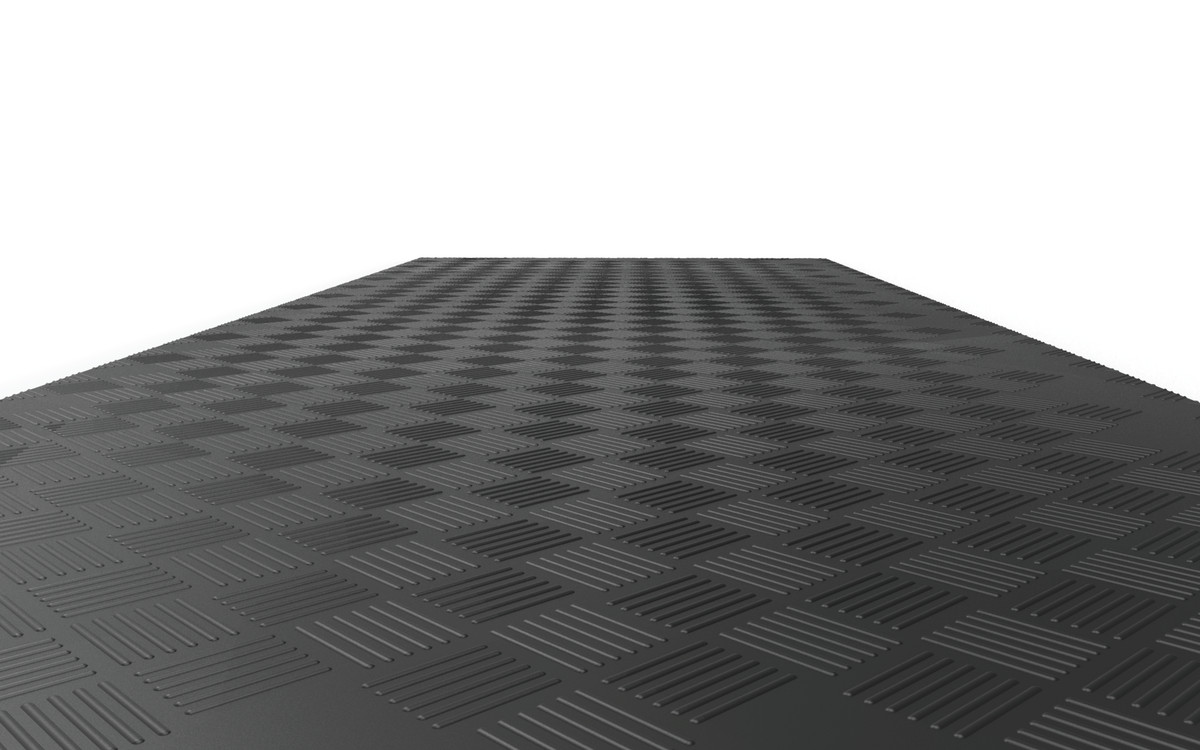 Slidstærk plast køreplade på 300x115 cm med dørk mønster og 4 praktiske håndtag for nem håndtering.