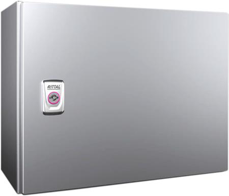 Kompakt styretavle AX i rustfri stål. Mål: 380x300x210 mm. Med enkelt låge og to vridelåse.