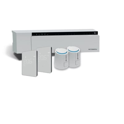 Komplet pakkeløsning med trådløst Alpha gulvvarmesystem til 2 zoner/rum, inklusiv 6-kreds styring, 2 telestater 230V og 2 Alpha Premium rumtermostater.