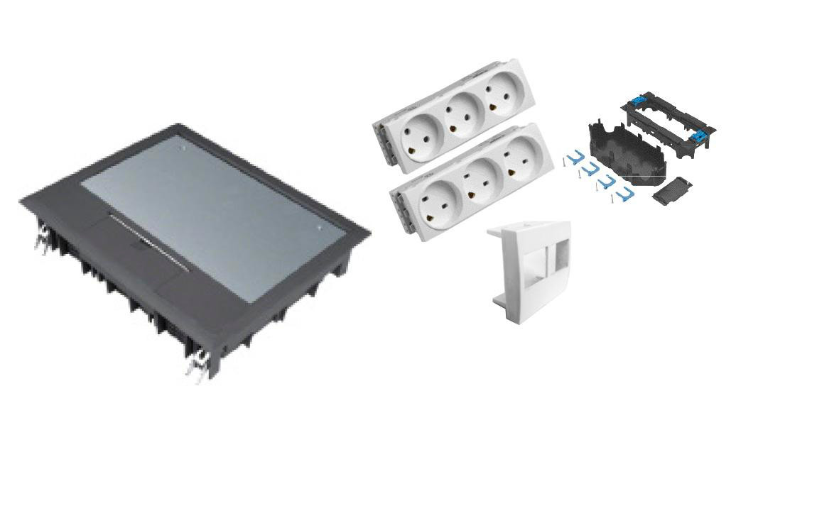 VE09 komplet gulvboks 200x253mm 12mm lågdybde sort. Inkl. 3 x 230V stikkontakter (én EDB) og 3 rammer til lexcom connectorer.