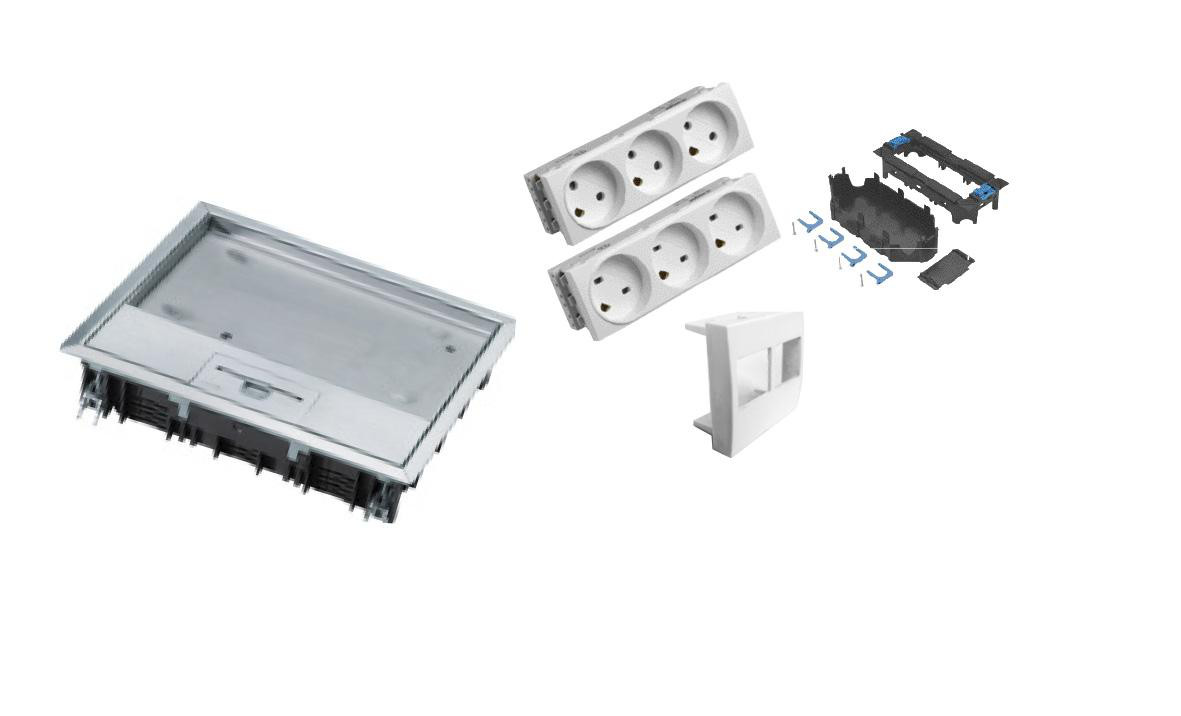 VE09 komplet gulvboks i rustfrit stål. Inkluderer stikkontakter og rammer til tilslutning af udstyr.