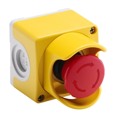 Komplet nødstop med 1-huls plastik kapsling, gul front og lysegrå bund. Inkluderer nødstop med beskyttelseskappe og 2NC frigiv drejefunktion.