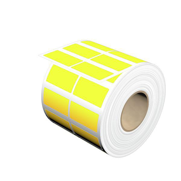 Gul selvklæbende komponentmærke (38x19mm) af bomuldstof med naturlig gummilim. Halogenfri og egnet til termoprintning. 1 rulle med 2.000 stk.