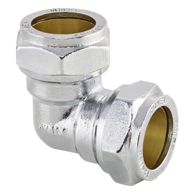Forkromet kompressionsvinkel med klemring. Velegnet til kobber, PEX og tyndvæggede stålrør. Bruges til drikkevand, varme og gas.