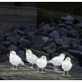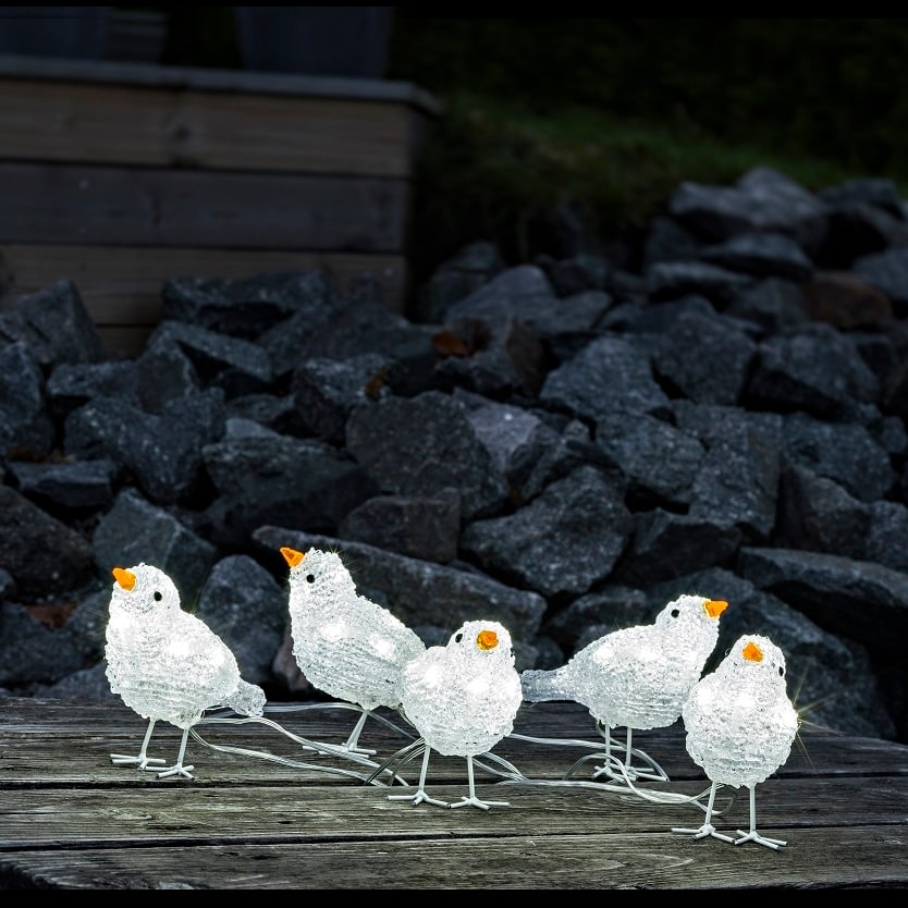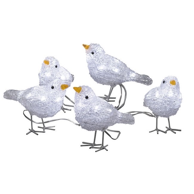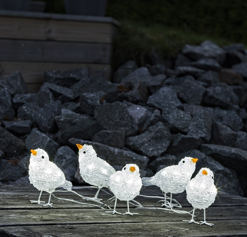 Fem små akryl fugle med 40 hvide lysdioder. Kan anvendes både inde og ude. Højden er 11,5 cm og afstanden mellem fuglene er 16 cm. IP44 transformer med 5 meter ledning medfølger.