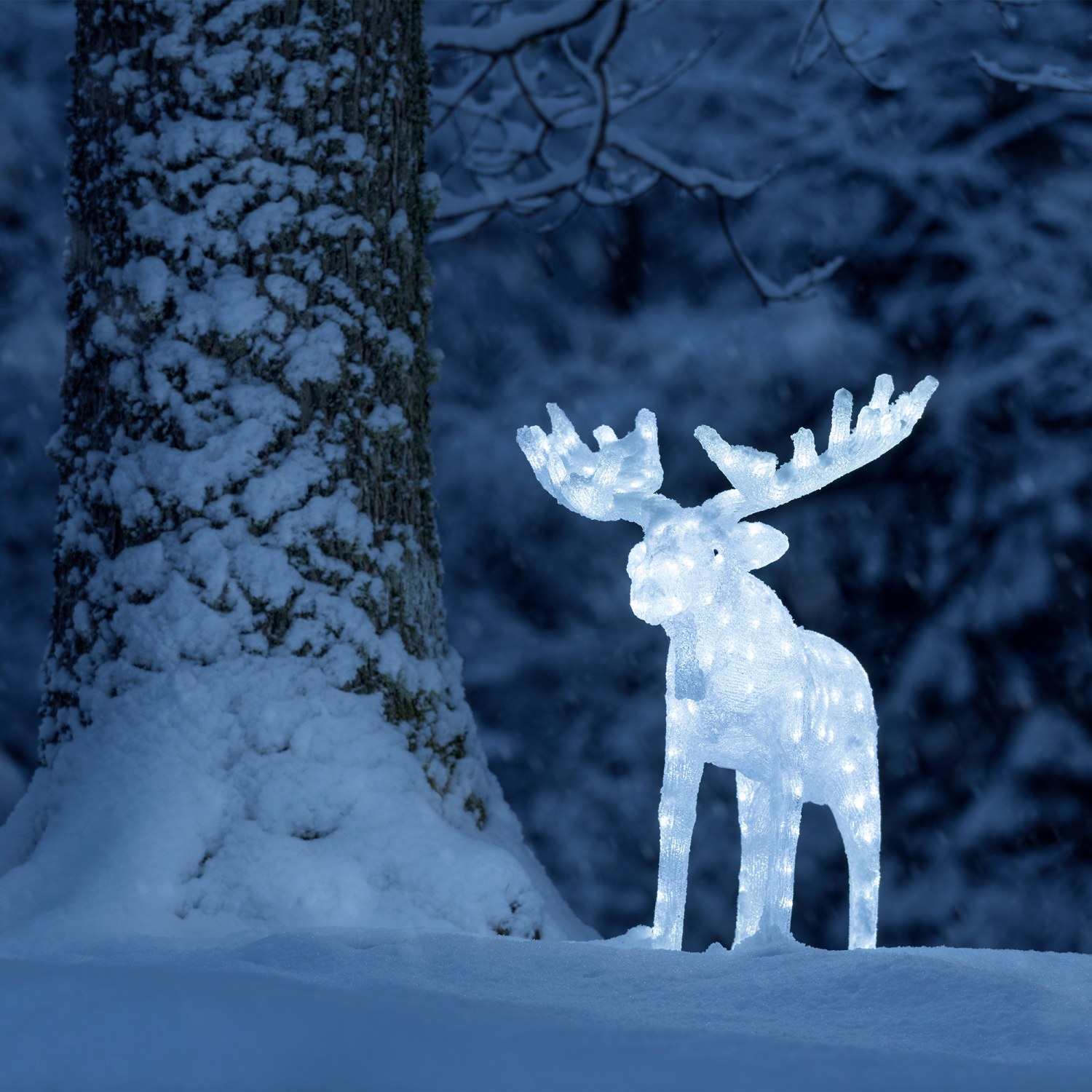 Figuren er gulvstående og leveres med en 24V/IP44 transformer, der sikrer en stabil og sikker strømforsyning. Tilslutningsledningen er 5 meter lang og i hvid farve, hvilket giver fleksibilitet i placeringen og let kan integreres diskret i indretningen. Med en effekt på 12 W bidrager elgen til en stemningsfuld belysning uden at være for energikrævende.
