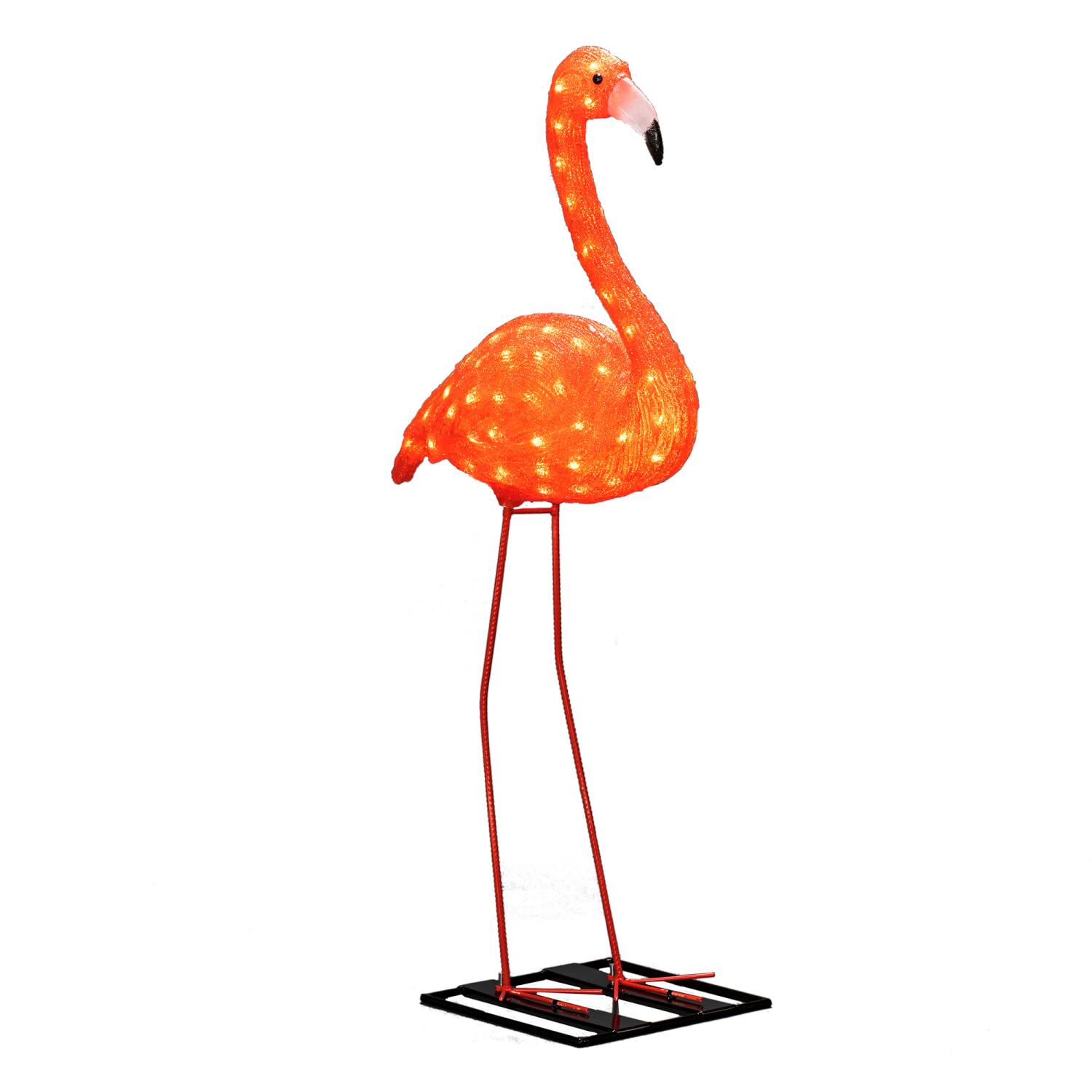 Konstsmide flamingo i akryl med 96 ravfarvede LED'er. H: 110 cm. Inkl. 24V/IP44 transformer med 500 cm ledning.