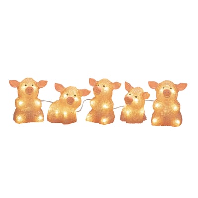 Dekorativ lyskæde med 5 grisefigurer i rosa akryl og 40 varmhvide LED. Inkluderer 24V/IP44 transformer med 500 cm ledning for nem opsætning.