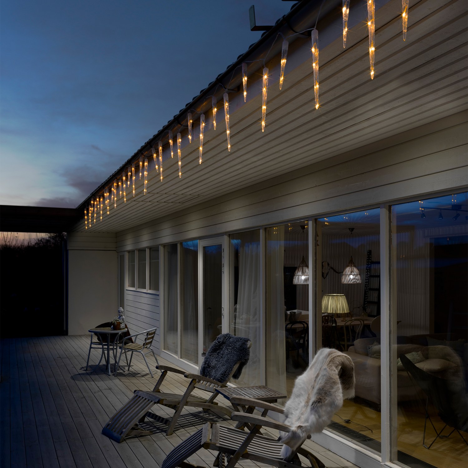Skab en hyggelig og festlig stemning udendørs med denne smukke Konstsmide istaplyskæde. Med 32 istapper og 48 ravfarvede LED-lys, spreder den en varm og indbydende glød i din have eller på dit hus.