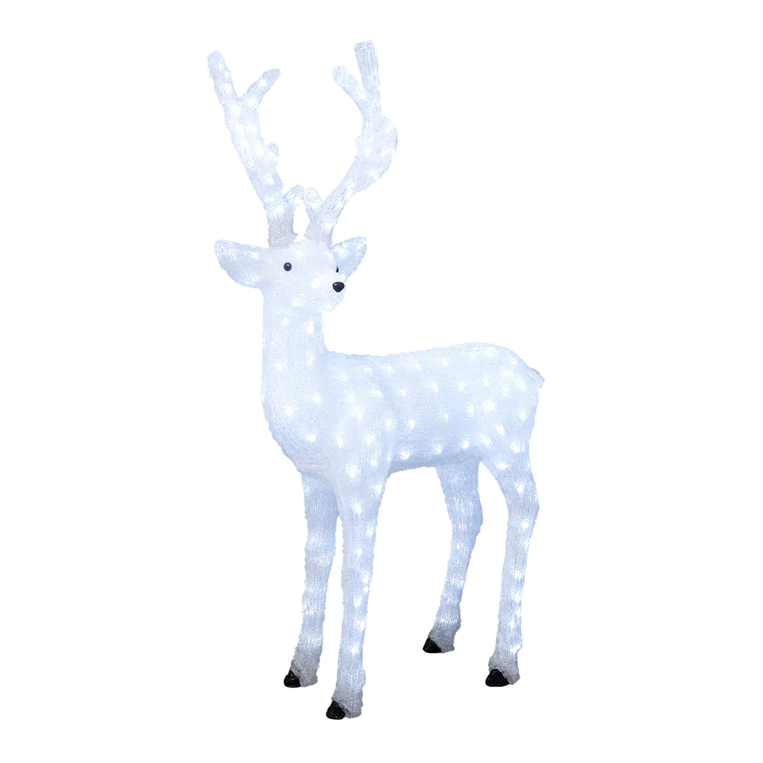Denne ren i akryl fra Konstsmide er en elegant tilføjelse til din juleudsmykning. Med sine 184 hvide LED skaber den en festlig og indbydende atmosfære i ethvert rum. Figuren er 130 cm høj og er designet til gulvstående montering, hvilket gør den nem at placere.