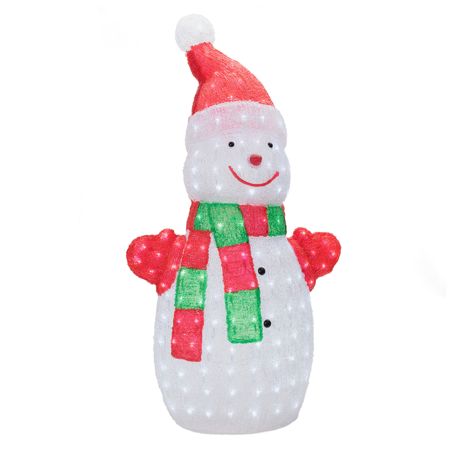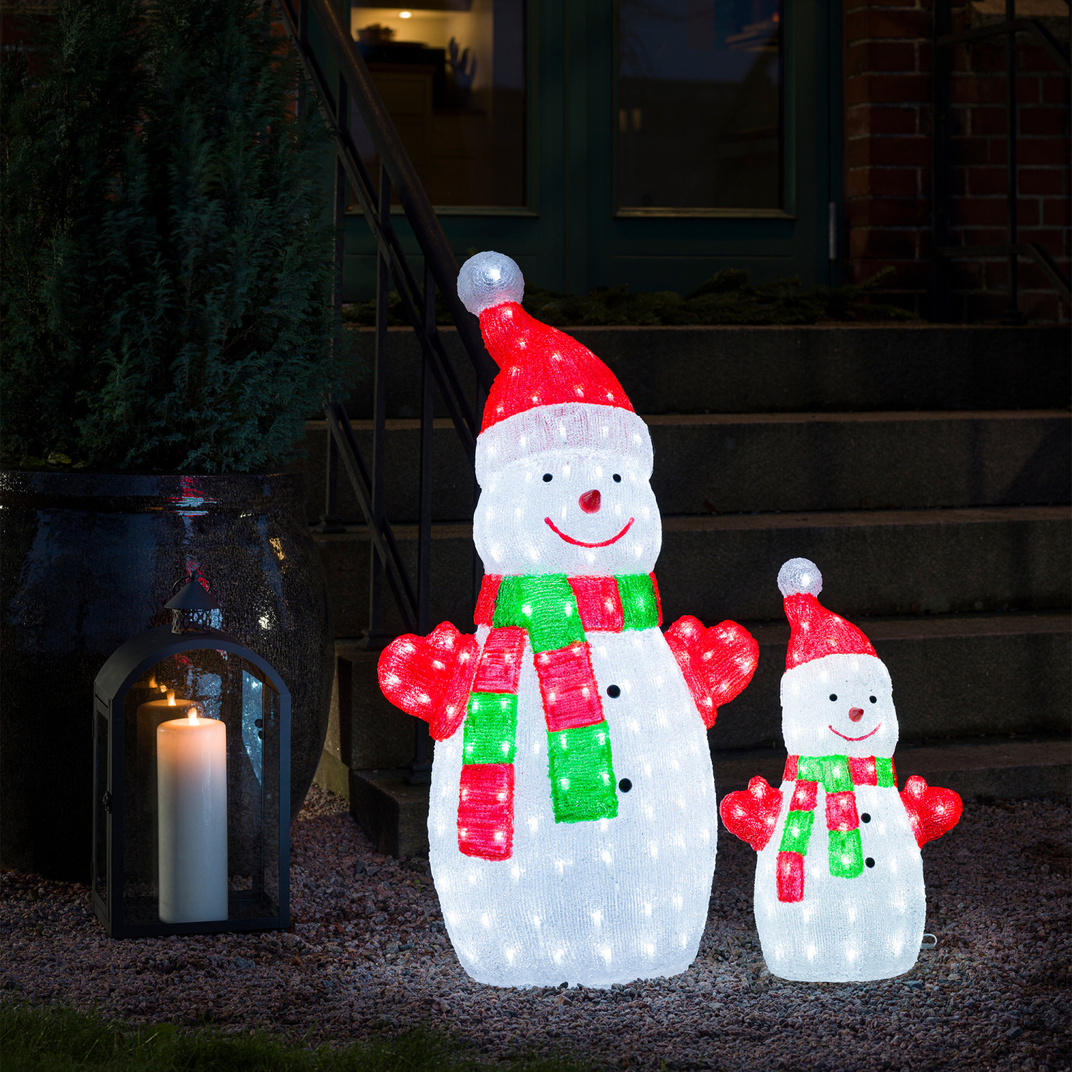 Oplys din juleudsmykning med denne snemand i akryl fra Konstsmide, udstyret med 200 hvide LED-lys. Måler 90 cm i højden og leveres med transformer.