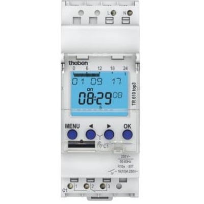 Digitalt kontaktur med ugeprogram, DuoFix fjederterminaler, og tekstorienteret brugervejledning. Forudindstillet dato og klokkeslæt. 56 hukommelsessteder.