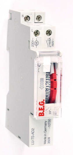 B.E.G. analog kontaktur til dag/uge. Med 1x slutte kontaktsæt og gangreserve. Til DIN skinne. Dimensioner: 45mmx17,5mm x 55mm. IP20, forbrug 0,4W.