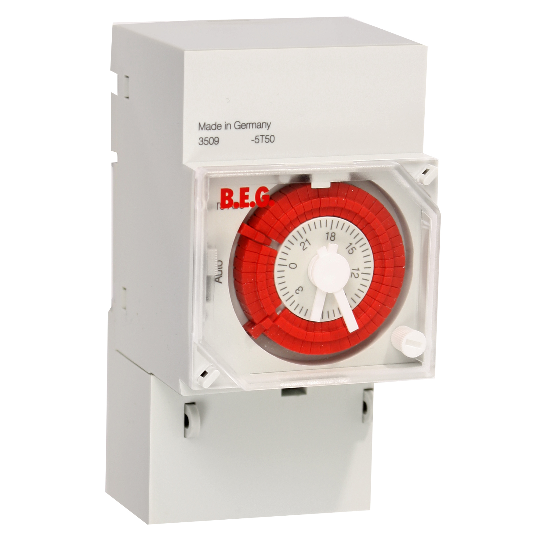 TS-AD3 dagsprogram med smal udformning (52,5mm). Skiftetaster, der ikke kan falde af, og overordnet håndafbryder til konstant-TIL automatik.