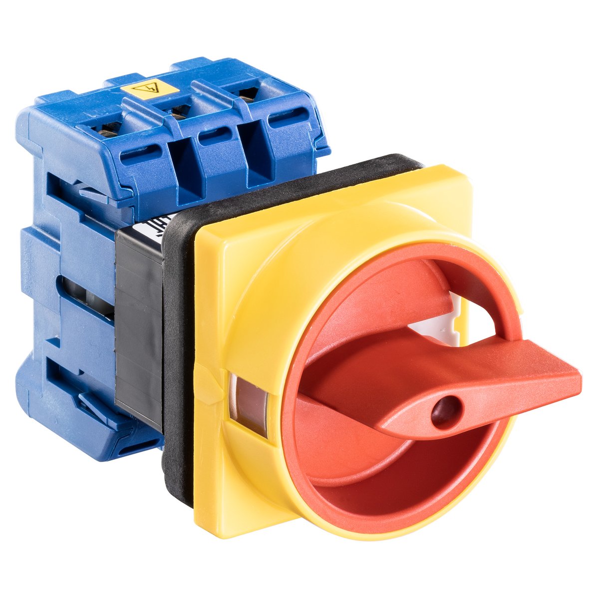 Kraus & Naimer KG10B.T203/01E er en 3-polet afbryderkontakt, 20A, designet til frontpanelmontage med fire huller og aflåseligt rød/gul greb.