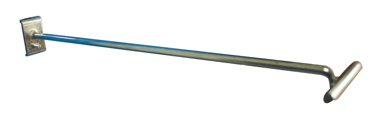 Krog med hyldeforkantsliste. Længde: 300 mm. Krog diameter: Ø6 mm. Passer til hulplade med firkantede huller. Huldimension 9 x 9 mm. Centerafstand 34 mm og 38 mm.