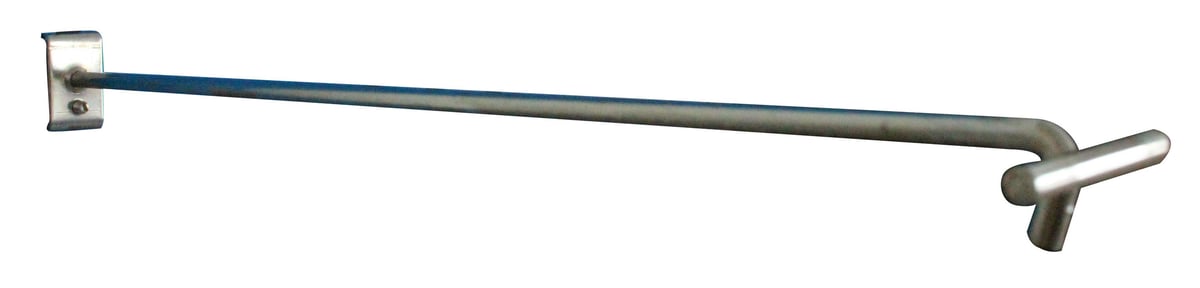 Krog med hyldeforkantsliste. Længde: 350 mm. Krog diameter: Ø6 mm. Passer til hulplade med firkantet huller. Huldimension 9 x 9 mm. Centerafstand 34 mm og 38 mm.