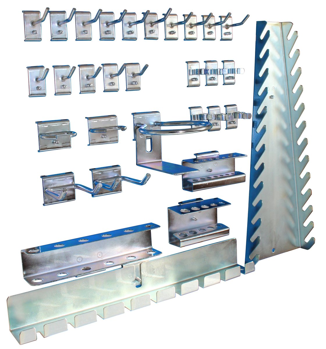 Standard krogsæt til hulplader. Indeholder ophæng til tænger, værktøjskroge, fjederklemmer, ophæng til skruetrækkere, file, smørrekande, ringgaffelnøgler og spiralbor.
