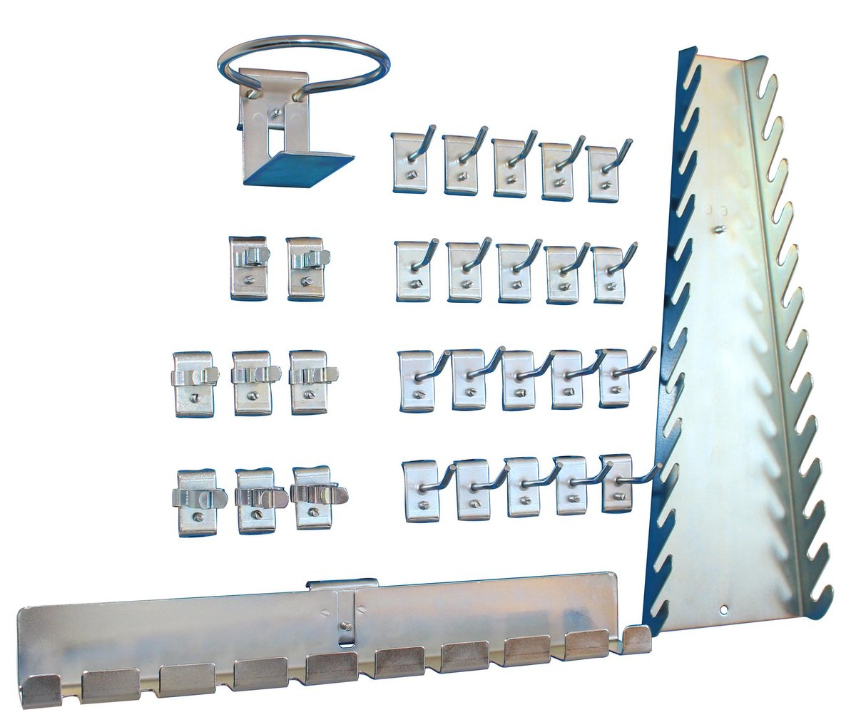 Standard krogsæt til hulplader. Indeholder: 10 værktøjskroge (30 mm, Ø4mm), 10 værktøjskroge (50 mm, Ø4 mm), fjederklemmer med bagplade og ophæng til værktøj. I alt 31 dele.