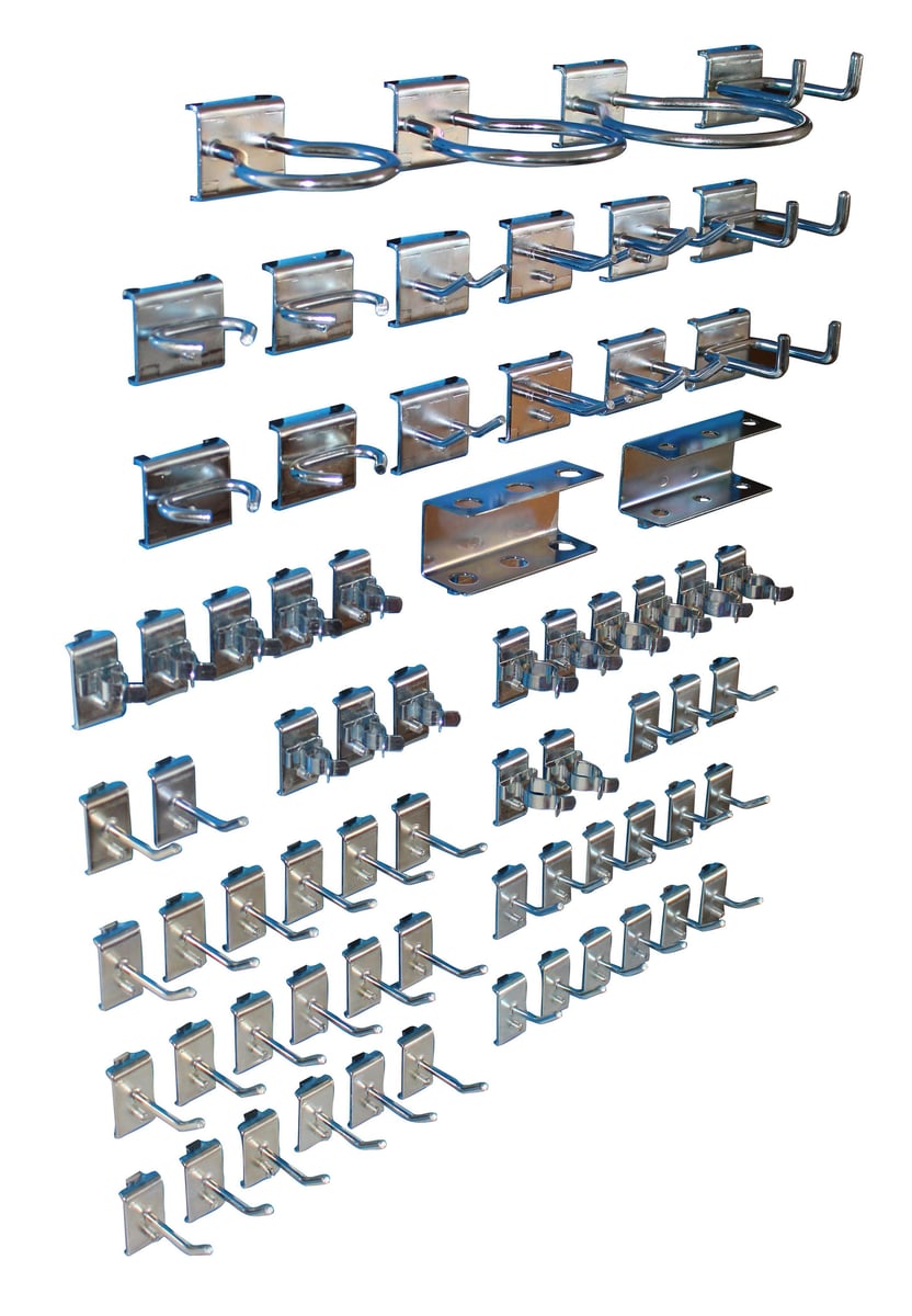 Standard krogsæt til hulplader. Indeholder værktøjskroge (30/50 mm), fjederklemmer, ophæng til skruetrækkere/tænger, ringe og dobbelte værktøjskroge. I alt 69 dele.