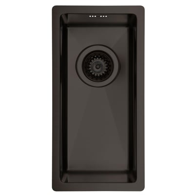 Rustfri stålvask uden hanehul i et moderne firkantet design. Brug vasken alene hvor pladsen er trang eller i en praktisk kombination med en større Kubus vask.De indvendige runde hjørner følger vaskens yderkant, hvilket giver et harmonisk design, ligeledes er de indvendige runde hjørner rengøringsvenlige. ,Kuvertbunden betyder at vandet nemt løber i afløbet. ,Med en ståltykkelse på 1,2 mm er vasken meget stabil. Denne stabilitet og de medfølgende monteringsclips betyder, at vasken kan monteres på forskellige måder: almindelig nedfældning, underlimning og planlimning.Der medfølger bundventil, vandlås og monteringsclips til nedfældning.Fremstillet i rustfrit stål med PVD* overflade behandling i farven Dark Bronze.*PVD betyder Physical Vapour Deposition og er en trykpåført overfladebehandling som giver en slidstærk overflade.