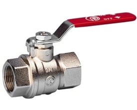 Kuglehane med fuldt gennemløb og aftap. Muffe/muffe. Rødt stålhåndtag.