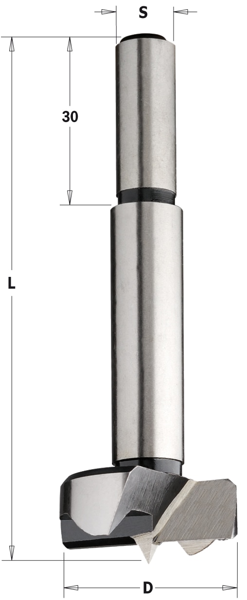 CMT kunstbor med cylindrisk kolbe. Fremstillet af SP Stål med centerspids og to skær (Z2) samt to forskær (V2). Ideel til boring af lukkede huller i blødt træ, f.eks. til hængsler.