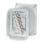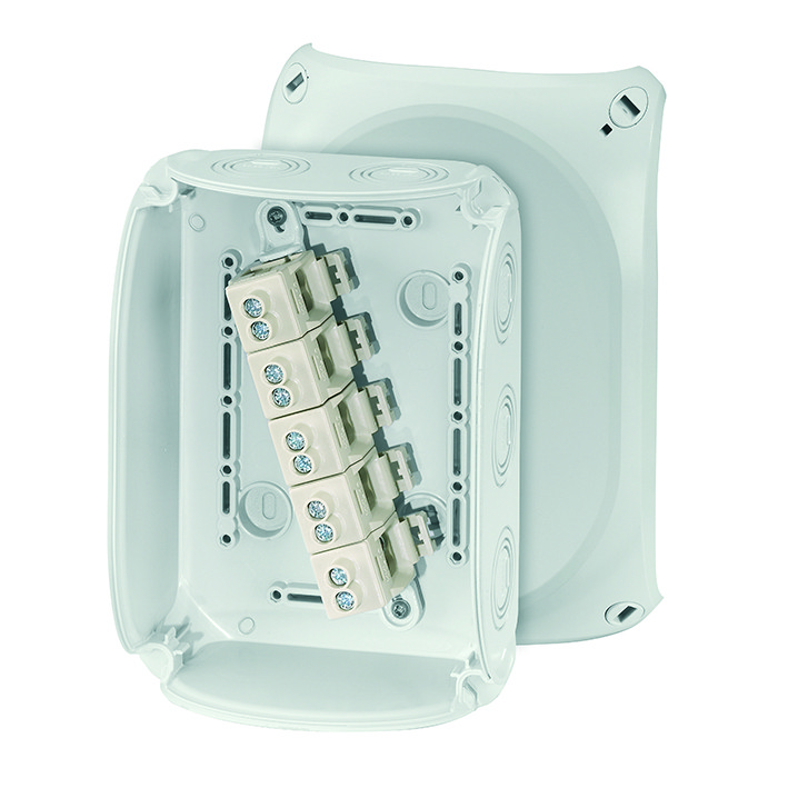 Vejrbestandig forgreningsdåse til udendørs brug. Med 5-polet klemme og 2xM25 kabelindføringer. IP66-klassificeret.