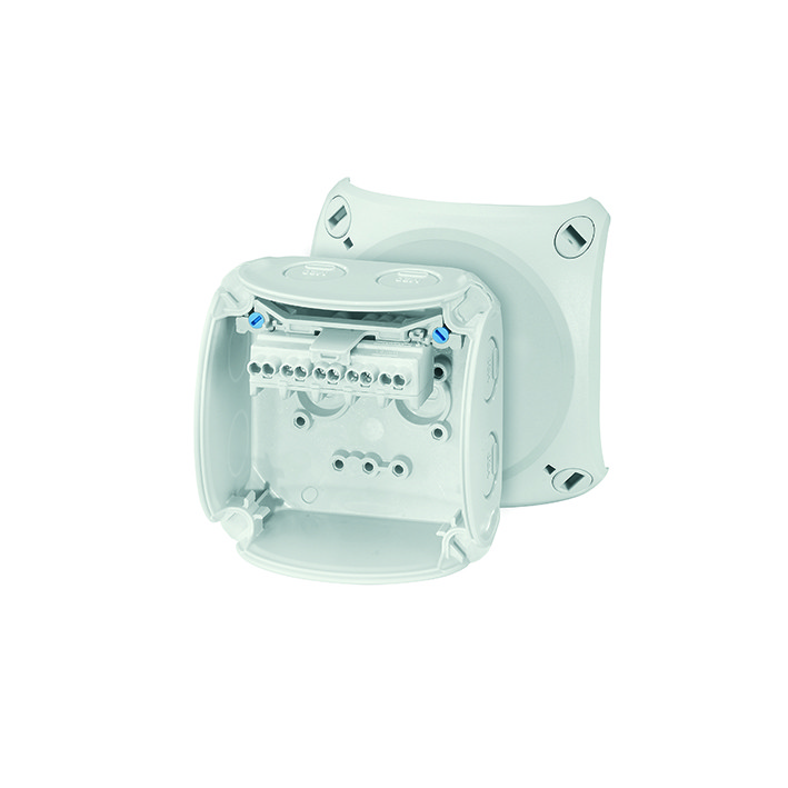 Vejrbestandig forgreningsdåse til udendørs brug. Med 5-polet klemme og plads til 2 klemsteder pr. pol.