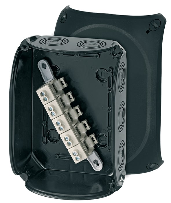 Vejrbestandig forgreningsdåse til udendørs brug. Med 5-polet klemme, 2 klemsteder pr. pol og to M32 kabelindføringer i bunden. Udslagsblanketter for kabelindføring.