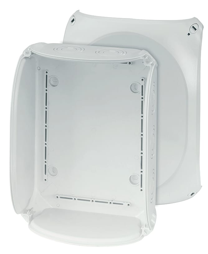 Denne vejrbestandige DK forgreningsdåse er ideel til ubeskyttet udendørs installation. Den leveres uden klemmer og har kabelindføringer via udslagsblanketter.