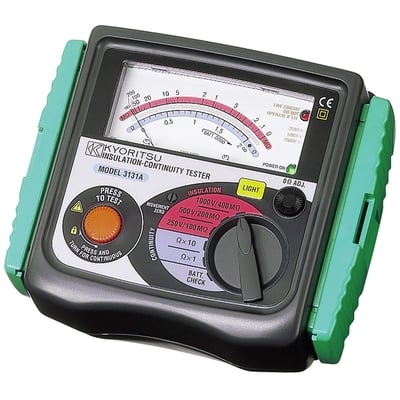 Kyoritsu K3131 isolationstester er et sikkert og robust instrument med valgfri prøvespænding (250, 500 og 1000V), låsbar testknap og belyst display.