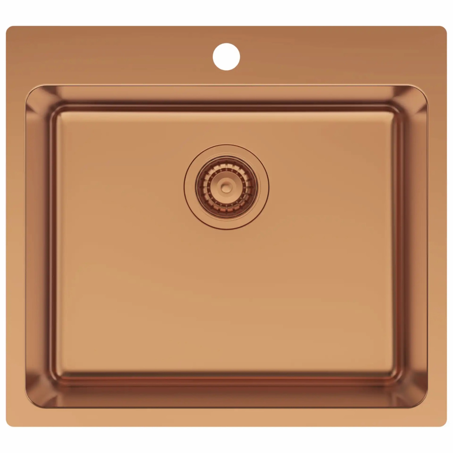 Moderne firkantet køkkenvask med hanehul. Fremstillet i rustfrit stål med PVD kobber overflade. Inkluderer bundventil, vandlås og monteringsclips til nedfældning.