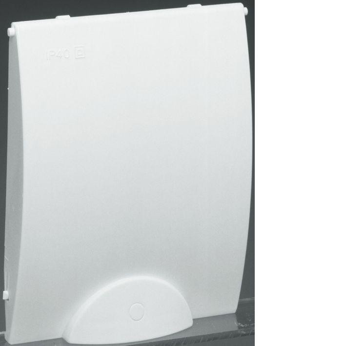 Hvid låge til GD104E fra Hager. IP40-klassificeret med monteret hængsel og i farven RAL 9010.