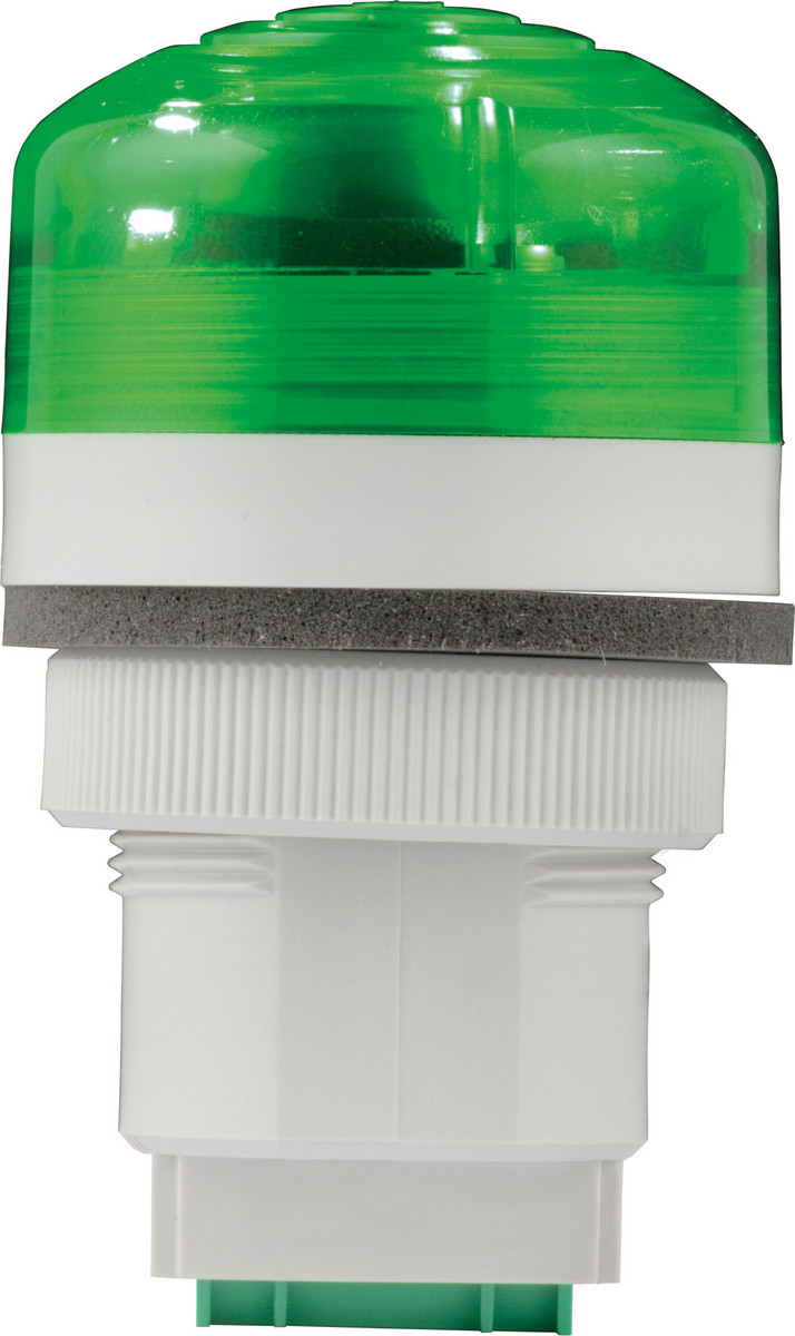 Grøn advarselslampe med LED og sirene til panelmontering (48-240V AC). Har 3 alarmniveauer: fast lys, blink med lyd, og fast lys med lyd. IP65.