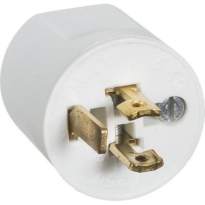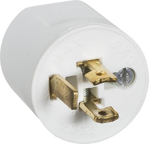 Hvid, rund lampestikprop med jord til indendørs brug. Max 250V, 10A.