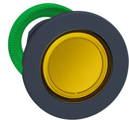 ZB5FW383 er et lampetrykhoved for flush montage og har en plan trykflade med fjeder-retur i gul farve. Hovedet er beregnet for LED belysning og har en ensartet oplyst overflade.