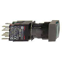 Lampetryk med frontring i plast, Ø 16 mm. Kvadratisk design med grøn kiptryk. Tilslutning via loddepin-stik eller ben til printkort. IP 65.